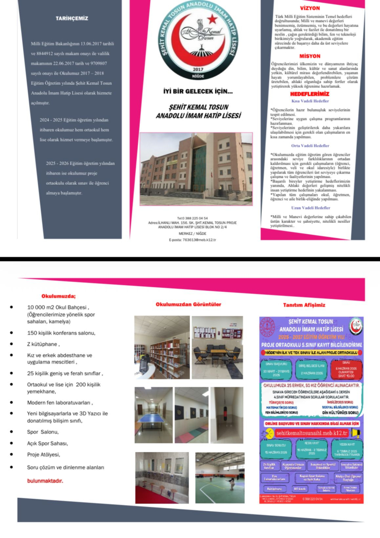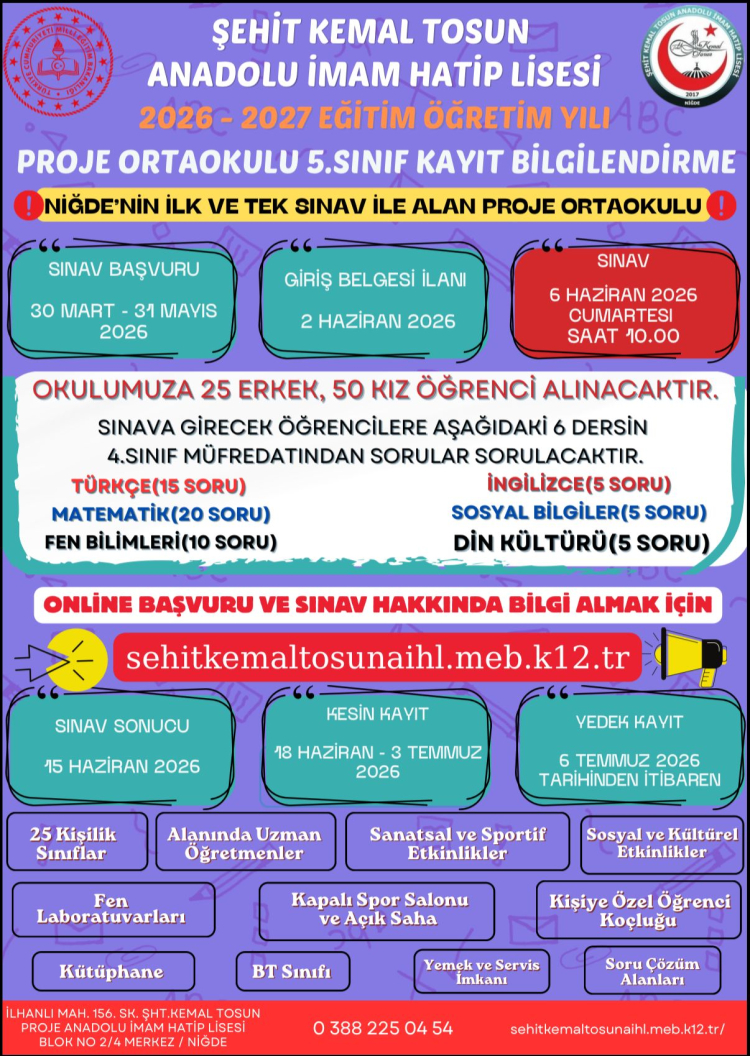 Geçtiğimiz yıl yoğun bir katılımla ilk defa 5. sınıfa sınavla 75 öğrenci alan Şehit Kemal Tosun Anadolu İmam Hatip Lisesi, bu sene de 50 kız öğrenci ve 25 erkek öğrenci almak için sınav takvimini netleştirdi.