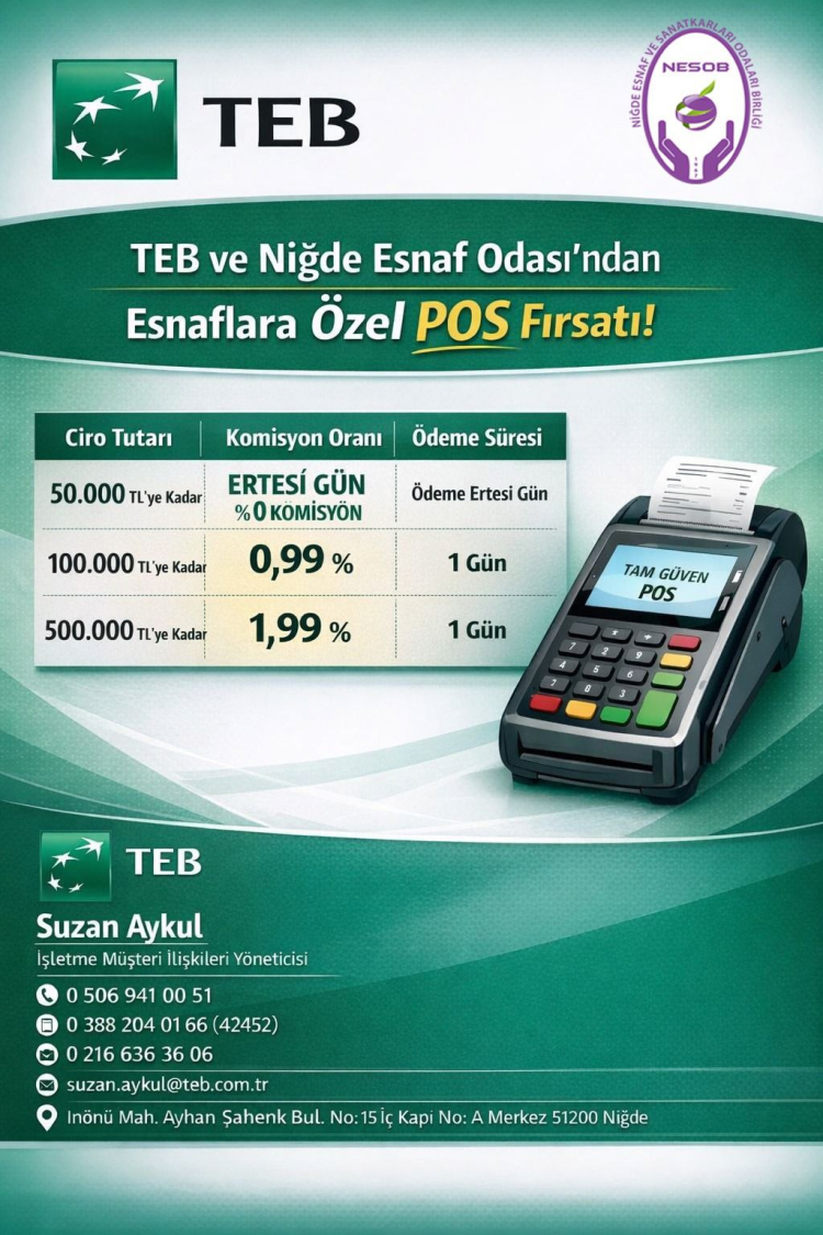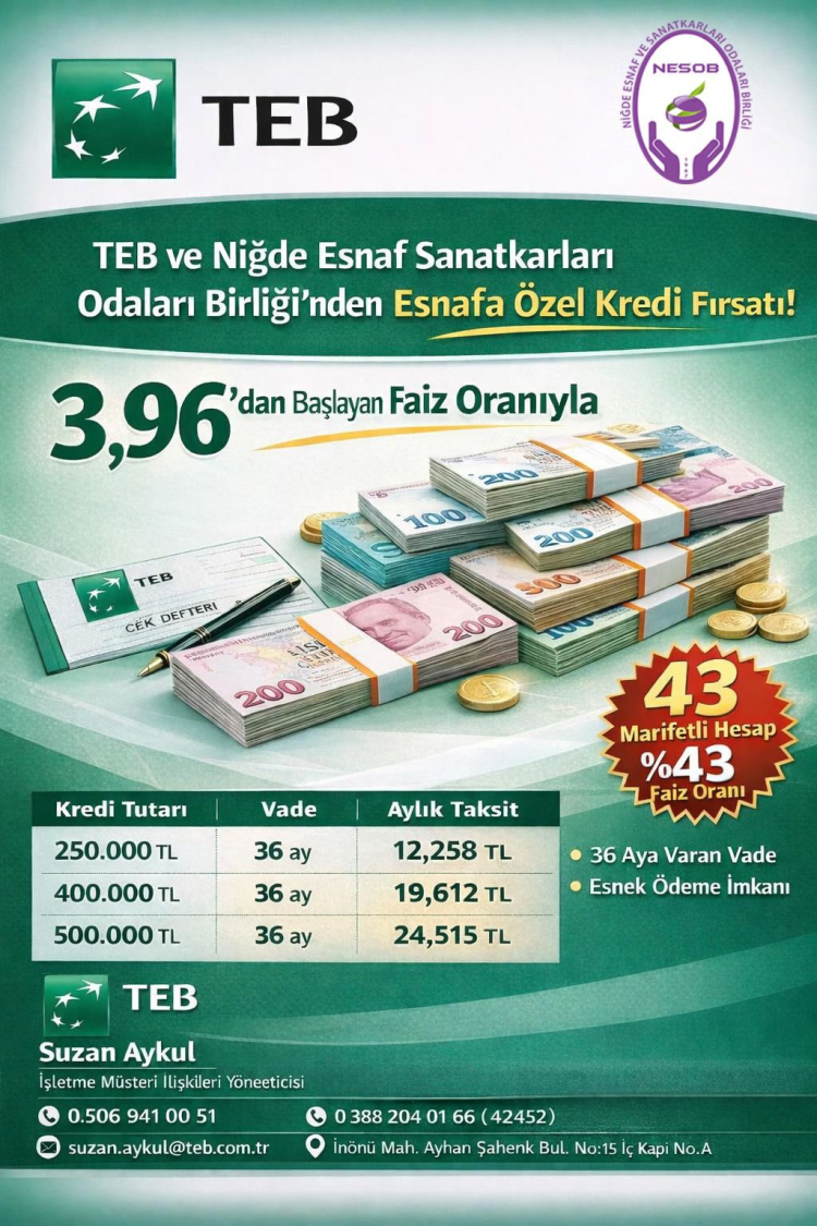 Niğde Esnaf ve Sanatkârlar Odaları Birliği (NESOB) ile Türk Ekonomi Bankası (TEB) arasında imzalanan iş birliği protokolü kapsamında, esnafa özel avantajlı kredi ve POS imkânları sunulacak.