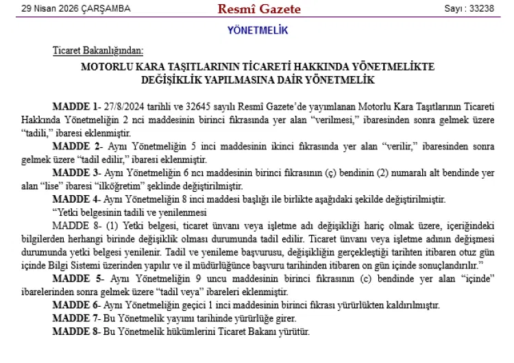 Ticaret Bakanlığı, motorlu kara taşıtı ticareti yönetmeliğini değiştirdi. Yetki belgelerine "tadil" süreci getirilirken, sektöre giriş için aranan eğitim şartı lise mezuniyetinden ilköğretim mezuniyetine düşürülerek esnetildi.
